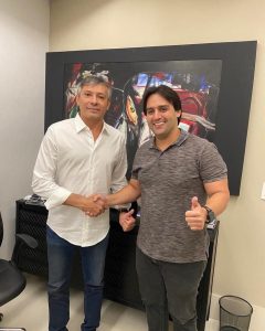 O publicitário Alex Anastácio recebendo a visita do governador Rafael Fonteles na agência de propaganda Nova Comunicação.