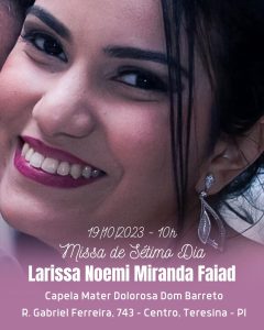 A missa de sétimo dia de Larissa Noemi Miranda Falad, acontecerá às 10h da manhã, na Capela do Instituto Dom Barreto, amanhã,18.