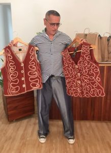 O estilista Otávio Menezes (Z Estúdio), criando peças exclusivas, com bordados manuais.